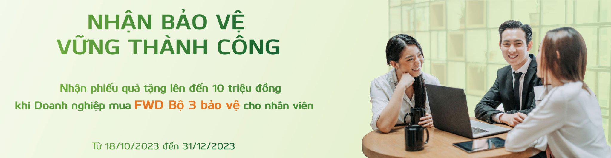 Đặc biệt, từ 18/10/2023, Quý khách hàng là Doanh nghiệp khi mua bảo hiểm FWD cho cán bộ nhân viên sẽ được hưởng ưu đãi từ chương trình khuyến mại hấp dẫn:
