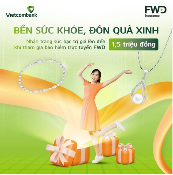 Vietcombank và FWD Việt Nam trân trọng thông báo triển khai chương trình khuyến mại “Bền sức khỏe, đón quà xinh ” – Nhận ngay quà tặng trang sức PNJ khi khách hàng mua bảo hiểm FWD trực tuyến trên VCB Digibank/VCB Website và đăng ký thanh toán tự động thành công.