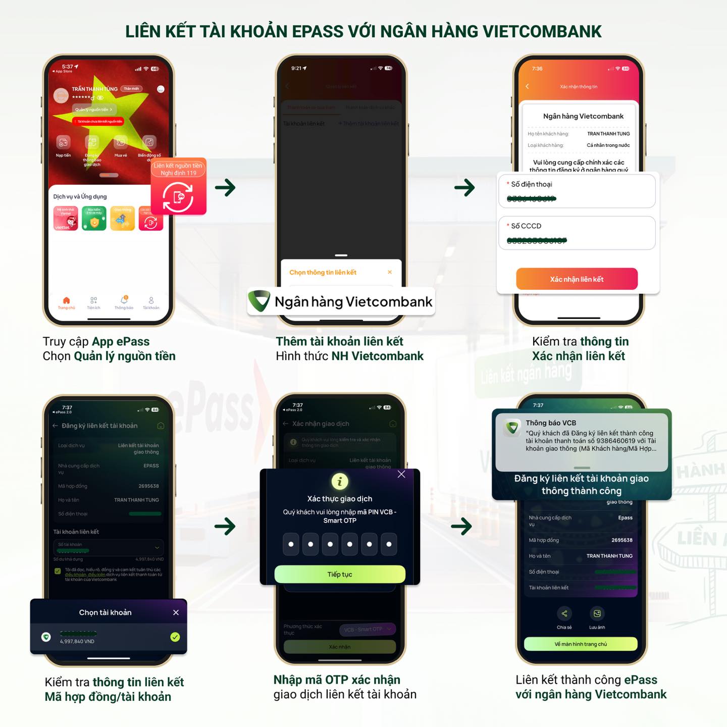 Để chuyển đổi sang TKGT ePass, chủ xe cần liên kết tài khoản ePass với tài khoản ngân hàng. Đặc biệt, Vietcombank là ngân hàng đầu tiên liên kết trực tiếp TKGT ePass với tài khoản Vietcombank. Khách hàng không cần nạp tiền từng lần, phí giao thông sẽ trừ thẳng qua tài khoản Vietcombank mỗi khi qua trạm ETC.