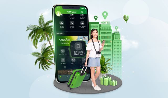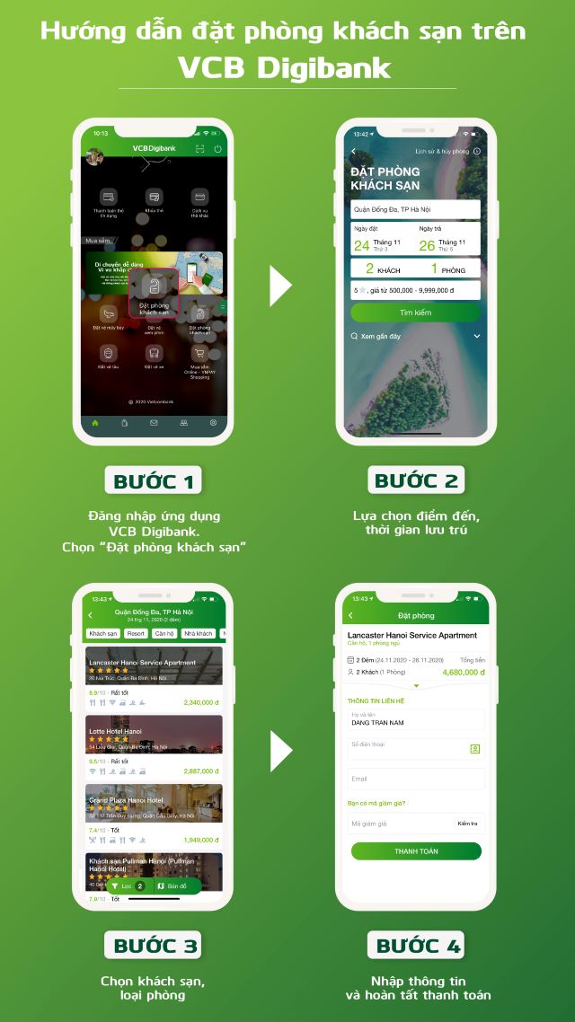 Trải nghiệm ngay tính năng Đặt phòng khách sạn trên ứng dụng VCB Digibank theo các bước sau: