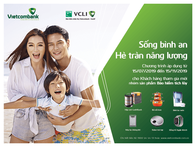 Vietcombank cùng công ty VCLI tiếp tục chương trình khuyến mại (CTKM) dành cho khách hàng mua mới dòng sản phẩm bảo hiểm tích lũy của VCLI do Vietcombank phân phối. CTKM với tên “Sống bình an, hè tràn năng lượng” mang đến khách hàng cơ hội nhận được hàng ngàn quà tặng hấp dẫn và giá trị, đặc biệt là Đồng hồ thông minh Apple trị giá 10.000.000 VNĐ.