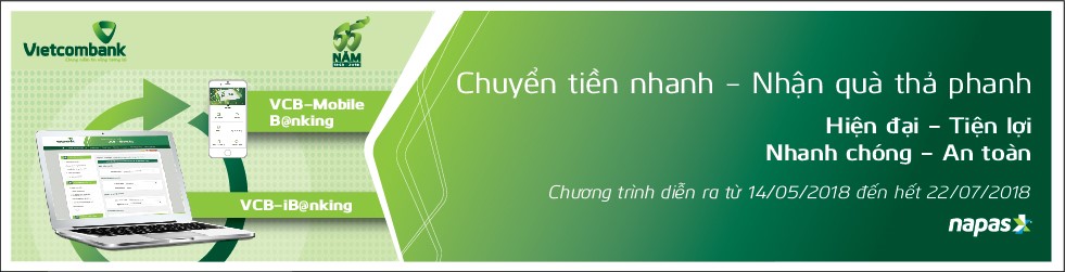 Từ ngày 14/05/2018 đến hết ngày 22/07/2018, Ngân hàng TMCP Ngoại Thương Việt Nam (Vietcombank) triển khai chương trình khuyến mại “Chuyển tiền nhanh – Nhận quà thả phanh” trên toàn quốc với nhiều giải thưởng hấp dẫn, tổng giá trị lên tới hơn 1.4 tỷ đồng. Chương trình gồm 2 nhóm giải thưởng: “Tri ân” và “Chào đón Khách hàng mới” với trị giá mỗi giải 100.000 đồng được dành tặng hàng tuần cho: