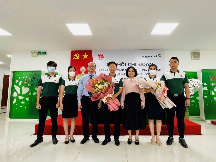 Đồng chí Dương Bảo Trung - Ủy viên BCH Đoàn Khối Doanh nghiệp Trung ương, Phó Bí thư thường trực Đoàn Vietcombank (thứ ba từ trái sang) và đồng chí Nguyễn Thị Vân - Bí thư Chi bộ, Giám đốc Vietcombank Đông Hải Phòng (thứ ba từ phải sang) chúc mừng Ban chấp hành Chi đoàn Vietcombank Đông Hải Phòng khóa I