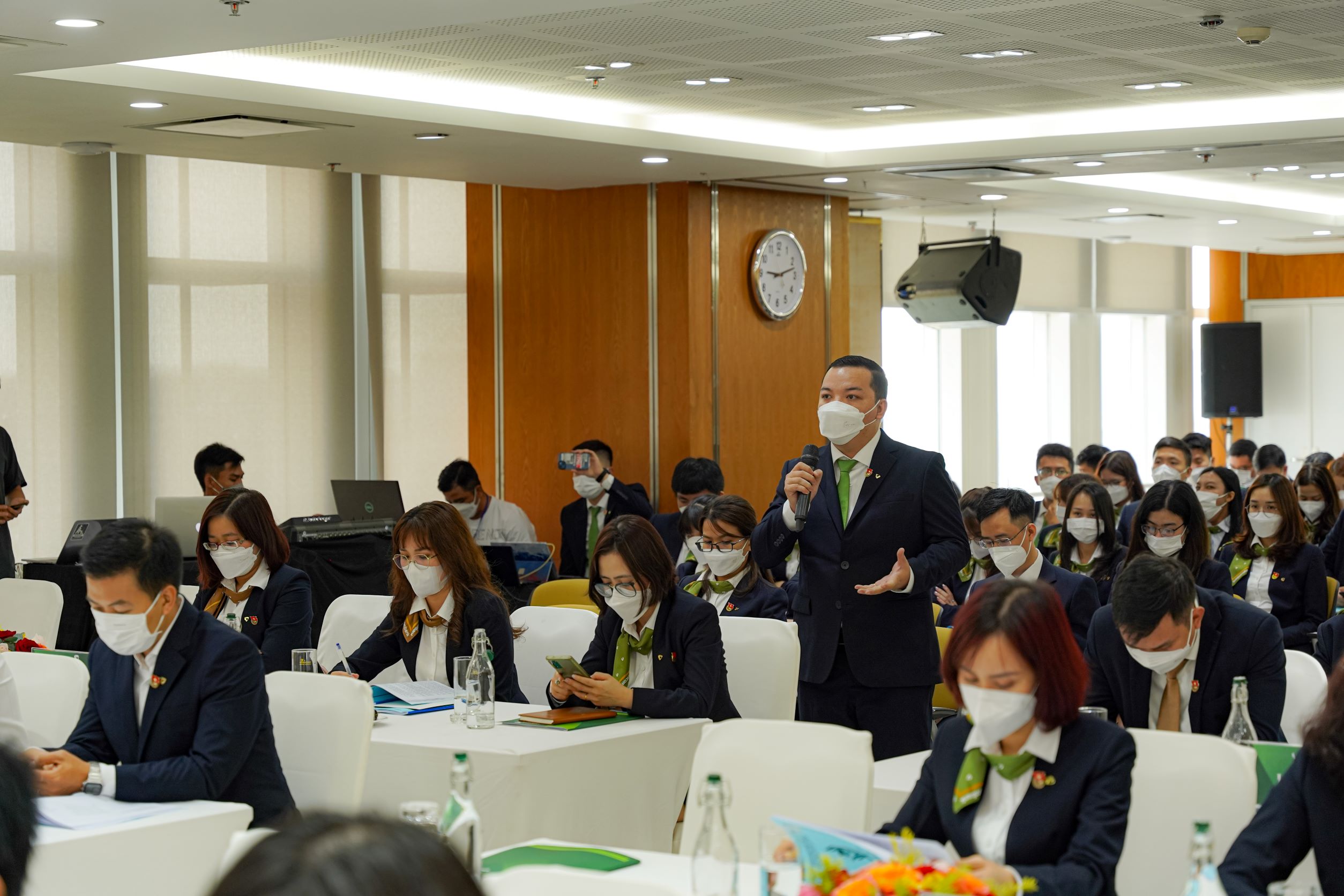 Đại hội vinh dự được đón tiếp đ/c Nguyễn Quỳnh Mai - Ủy viên BCH Đoàn Khối Doanh nghiệp Trung ương, Bí thư Đoàn Vietcombank, Phó Giám đốc Ban Khách hàng Doanh nghiệp TSC tham dự trực tuyến; đ/c Dương Bảo Trung - Ủy viên UBKT Đoàn Khối Doanh nghiệp Trung ương, Phó Bí thư thường trực Đoàn Vietcombank, các đ/c trong Ban thường vụ Đoàn Vietcombank, 13 cơ sở Đoàn Chi nhánh Vietcombank tham dự trực tiếp và 54 cơ sở Đoàn Chi nhánh Vietcombank tham dự trực tuyến để đảm bảo an toàn dịch bệnh.