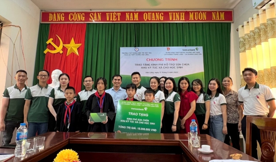 vừa qua, Ban chấp hành Đoàn cơ sở (ĐCS) Vietcombank Thăng Long và Vietcombank Lạng Sơn đã phối hợp tổ chức trao tặng kinh phí sửa chữa khu ký túc xá cho học sinh tại Trường Phổ thông dân tộc nội trú THCS và THPT huyện Văn Lãng và 5 bộ máy tính cho học sinh tại Trường Phổ thông dân tộc nội trú THCS và THPT huyện Cao Lộc, tỉnh Lạng Sơn.