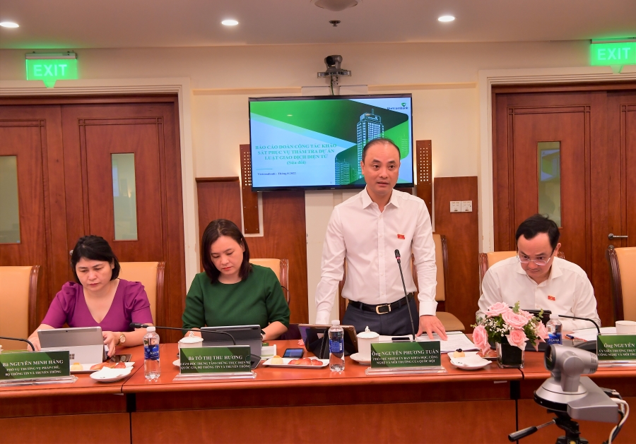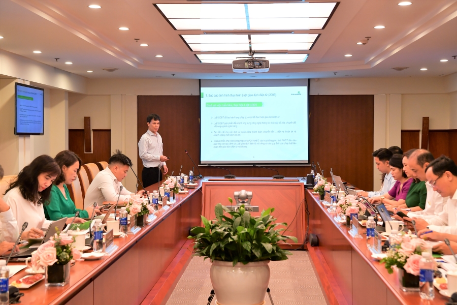 Tại buổi làm việc, ông Nguyễn Văn Phương - Trưởng phòng Pháp chế đã trình bày báo cáo tóm tắt tình hình triển khai Luật Giao dịch điện tử và đề xuất, kiến nghị sửa đổi Luật Giao dịch điện tử.