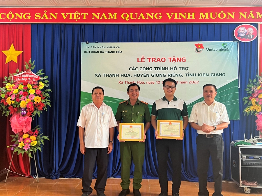 Bên cạnh đó, ĐTN cơ sở Vietcombank Hồ Chí Minh cũng đã trao tặng địa phương các công trình ASXH thiết thực như: 01 “ngôi nhà yêu thương” cho hộ gia đình khó khăn nhất địa phương trị giá 50 triệu đồng; 48 thẻ BHYT cho học sinh nghèo và hộ gia đình khó khăn trị giá 26 triệu đồng; 02 khu vui chơi thiếu nhi trị giá 30 triệu đồng và 20 hố rác gia đình trị giá 10 triệu đồng. Tổng giá trị trao tặng ASXH cho xã Thạnh Hòa là 161 triệu đồng, số tiền này đã được CBNV Chi nhánh tự nguyện đóng góp trên tinh thần sẻ chia vì cộng đồng.