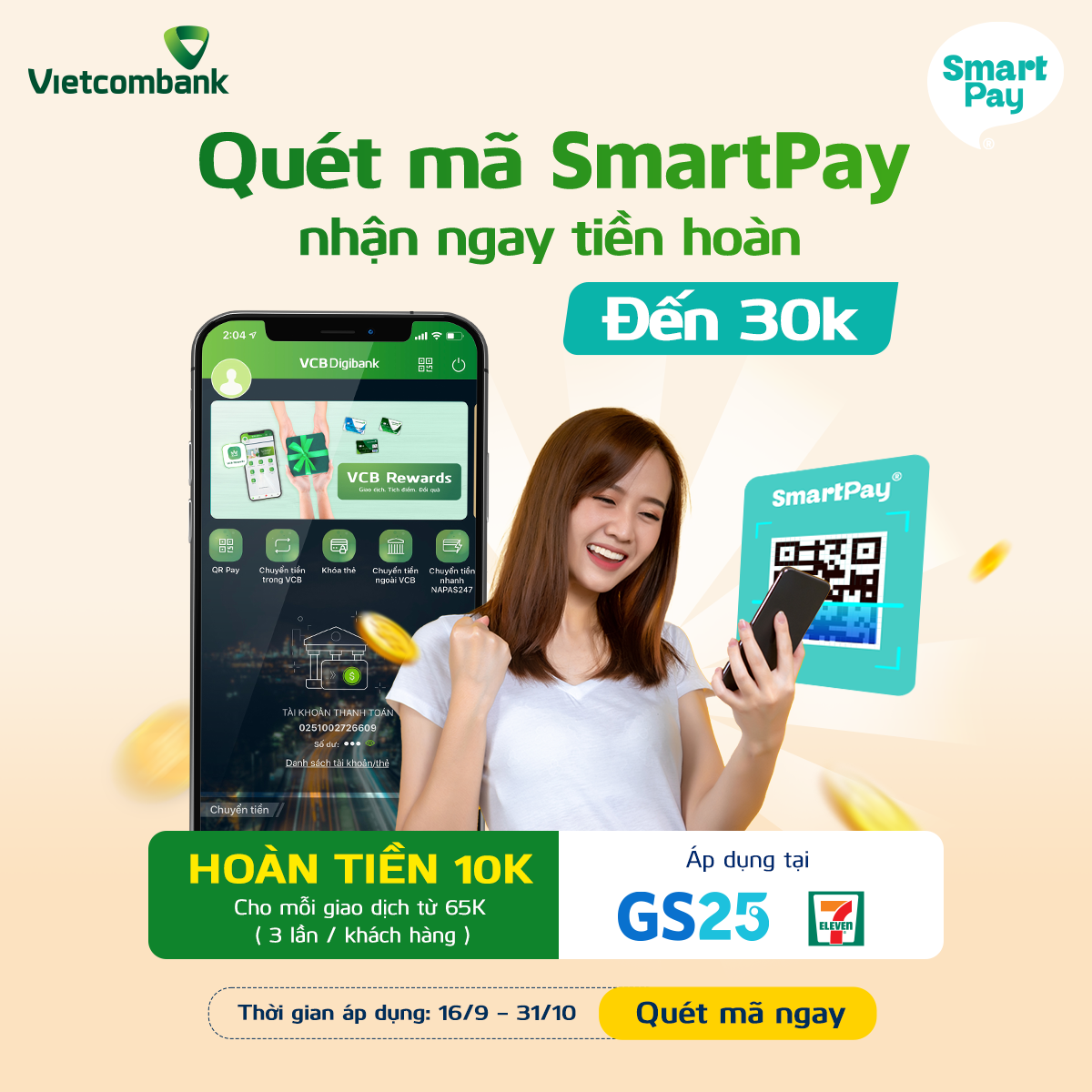 Tiền thưởng được Vietcombank và SmartPay hoàn vào tài khoản Vietcombank của Quý khách.