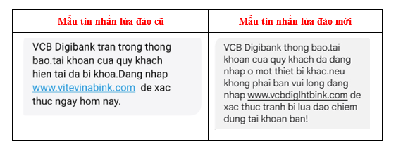 Đây là các thủ đoạn đã được ngân hàng và các cơ quan báo chí đã liên tục cảnh báo trong thời gian qua và đang có diễn biến phức tạp. Các đối tượng lừa đảo liên tục thay đổi nội dung tin nhắn SMS giả mạo để thực hiện hành vi lừa đảo.