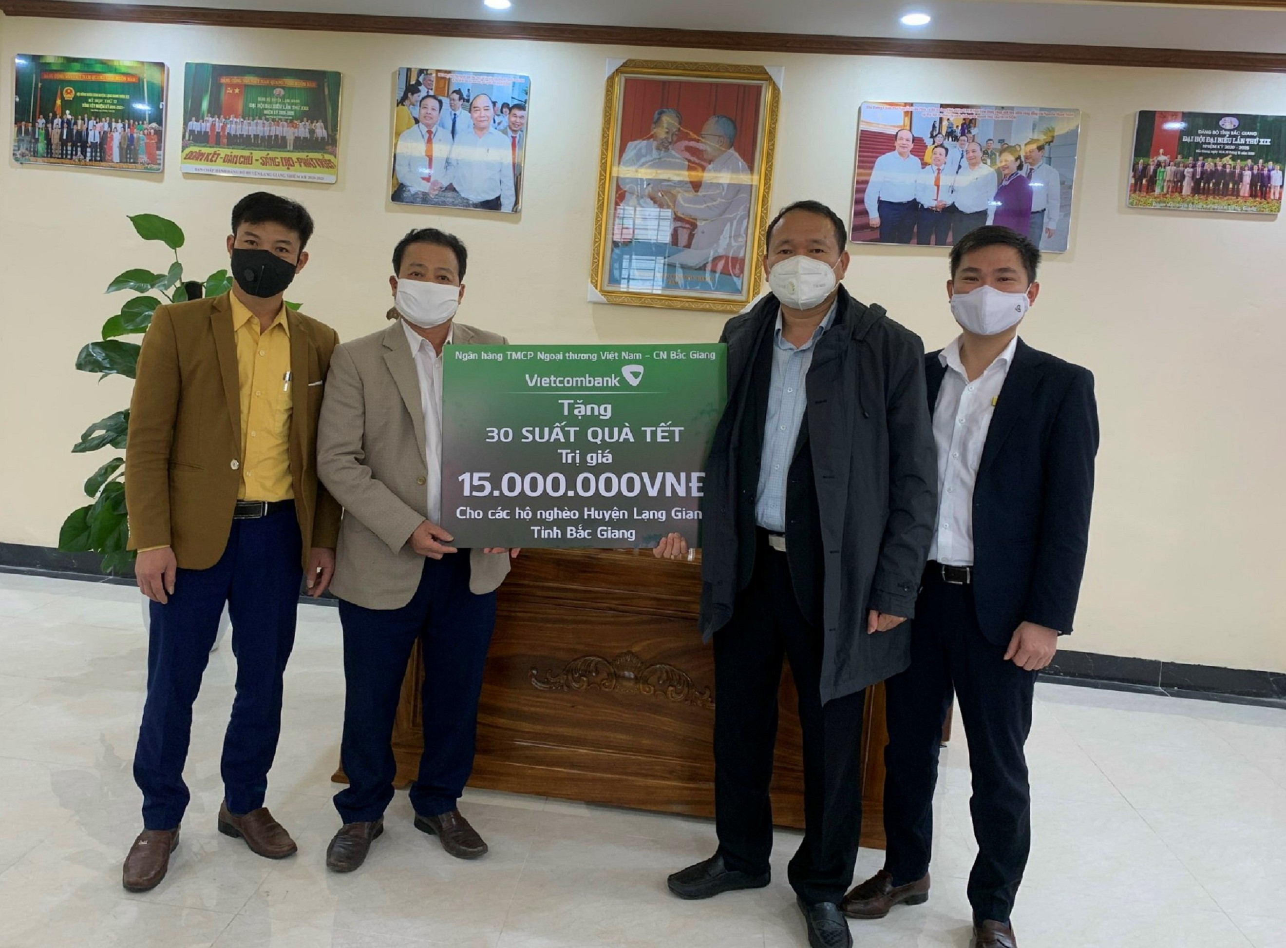Ông Lê Xuân Trường – Phó Giám đốc Vietcombank Bắc Giang (thứ 2 từ phải sang) trao quà tết cho UBMTTQ huyệt Lạng Giang