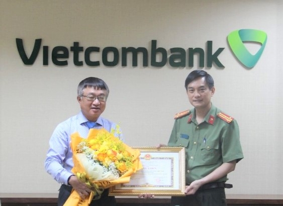 Thượng tá Đỗ Đức Trịnh - Phó Giám đốc Công an tỉnh Bắc Giang (bên phải) trao tặng Bằng khen Đơn vị có thành tích xuất sắc trong phong trào “Toàn dân bảo vệ an ninh Tổ quốc” năm 2021 của Chủ tịch UBND tỉnh Bắc Giang cho ông Lê Hồng Tâm - Giám đốc, đại diện Vietcombank Bắc Giang