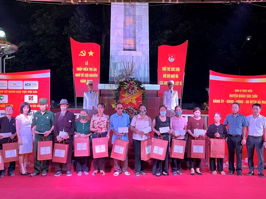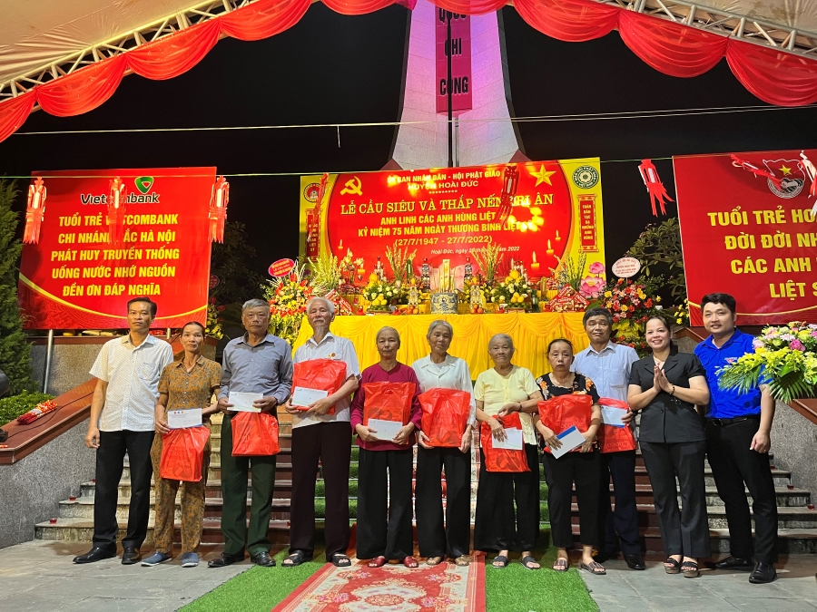 Vào ngày 26/7/2022, đoàn do đồng chí Nguyễn Trọng Khoa - Phó Bí thư Chi bộ, Phó Giám đốc Chi nhánh; đồng chí Trần Xuân Bách - Bí thư Đoàn thanh niên Chi nhánh cùng gần 30 ĐVTN đã tổ chức viếng, tham gia chương trình “Lễ cầu siêu và thắp nến tri ân” tại đài tưởng niệm liệt sĩ huyện Hoài Đức do huyện Đoàn Hoài Đức phối hợp tổ chức. Tại đây, Vietcombank Bắc Hà Nội đã trao tặng 60 suất quà với tổng trị giá 30 triệu đồng đến các gia đình chính sách, người có công với cách mạng.