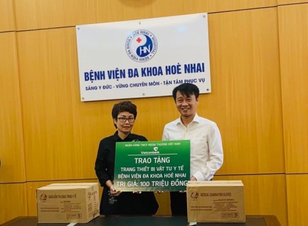 Ông Nguyễn Thanh Bình - Phó Giám đốc Vietcombank Hưng Yên (bên phải) trao tặng trang thiết bị vật tư y tế cho TS.BS Phan Thị Thanh Bình - Giám đốc bệnh viện Đa khoa Hòe Nhai