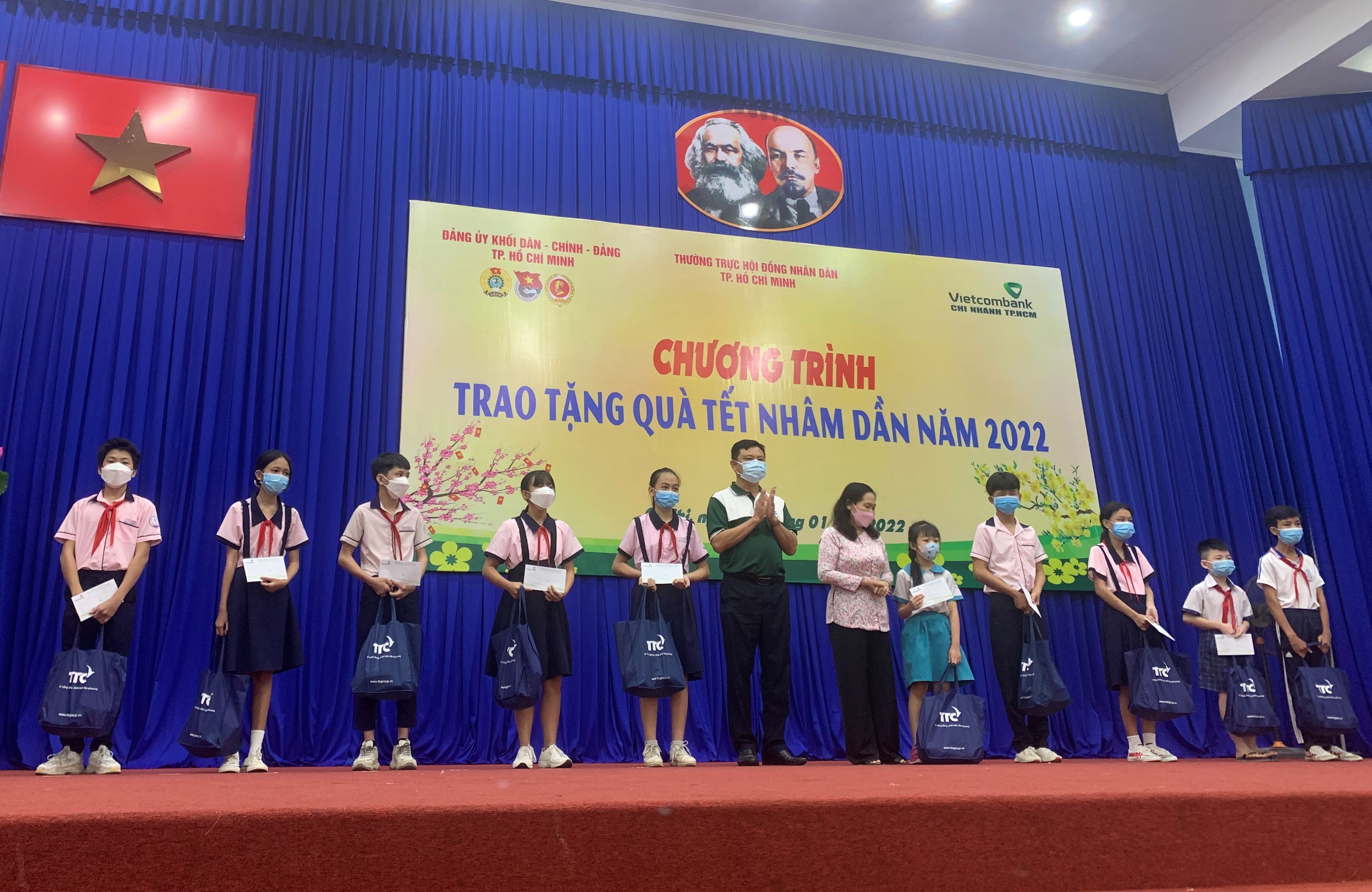 Ông Bùi Văn Khanh – Phó Giám đốc Vietcombank Tp HCM , Chủ tịch Công đoàn (thứ 6 từ trái sang) tặng quà cho các em thiếu nhi có hoàn cảnh khó khăn tại 3 huyện Củ Chi, Hóc Môn, Bình Chánh