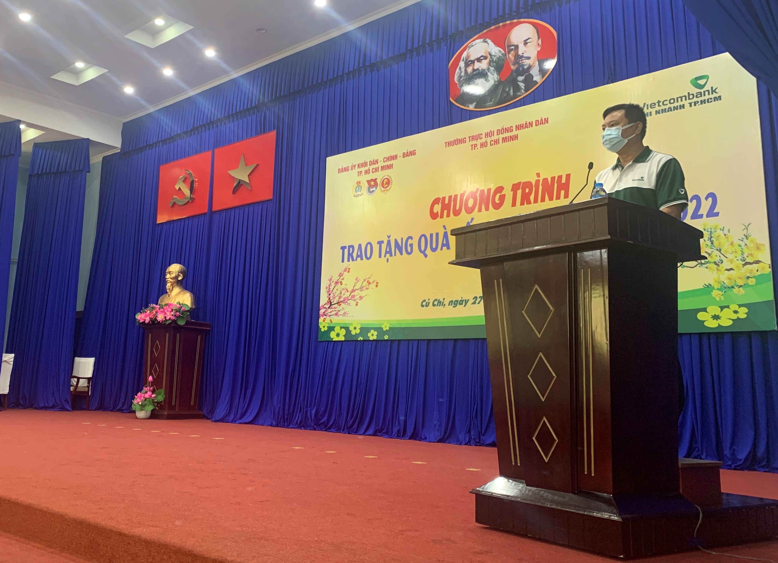 Phát biểu tại sự kiện, ông Bùi Văn Khanh - Phó Giám đốc Vietcombank Tp. HCM, Chủ tịch công đoàn đại diện Chi nhánh cảm ơn Đảng ủy khối Dân-Chính-Đảng Tp. HCM đã luôn tạo nhiều cơ hội kết nối giữa Vietcombank Tp. HCM và các địa phương. Từ đó Vietcombank Tp. HCM thực hiện được những hoạt động ASXH ý nghĩa, được gửi gắm tình cảm thân ái, sẻ chia của tập thể CBNV người lao động đến những hoàn cảnh khó khăn trong cuộc sống, đặc biệt trong năm 2021 với nhiều ảnh hưởng do đại dịch COVID-19 mà Củ Chi, Hóc Môn và Bình Chánh là 3 địa phương chịu ảnh hưởng lớn nhất.