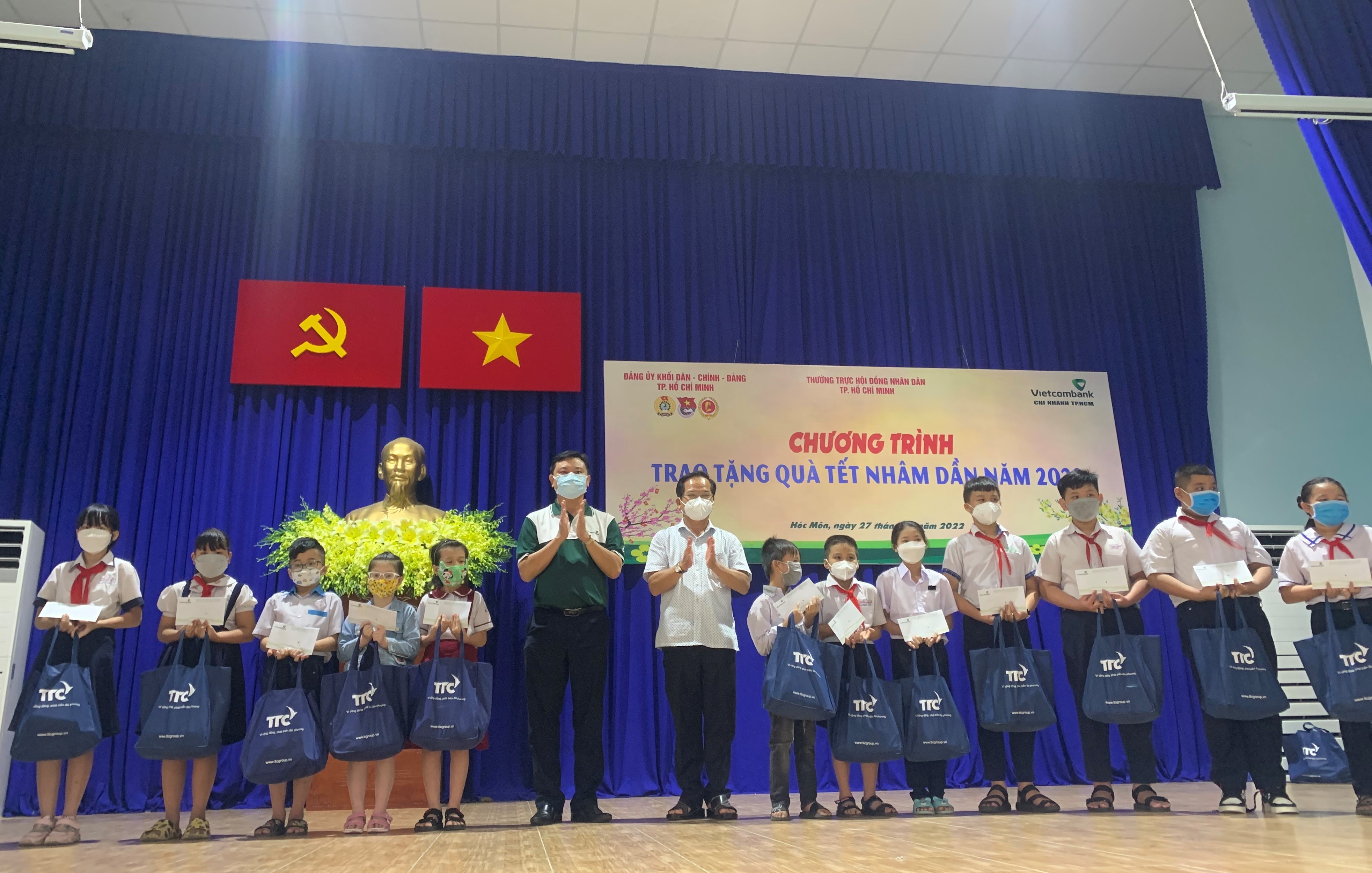Đại diện Vietcombank Tp HCM cùng các lãnh đạo Thành ủy, HĐND, Đảng ủy khối Dân-Chính-Đảng trao biểu trưng cho đại diện các huyện Củ Chi, Hóc Môn và Bình Chánh