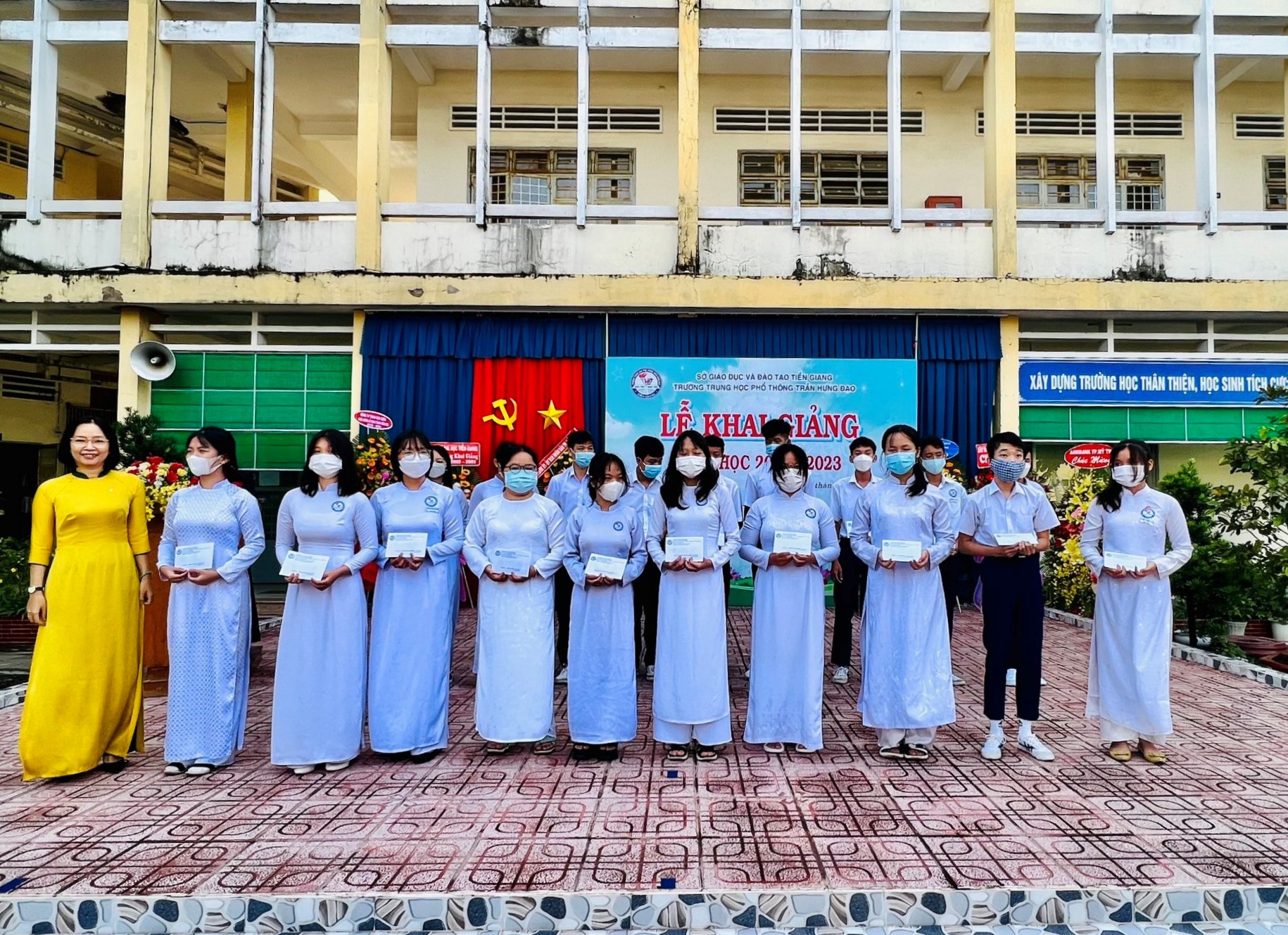 Bà Võ Thị Phỉ - Trưởng phòng giao dịch Mỹ Tho Vietcombank Tiền Giang (đầu tiên từ trái sang) trao học bổng tại trường THPT Trần Hưng Đạo, TP Mỹ Tho, tỉnh Tiền Giang