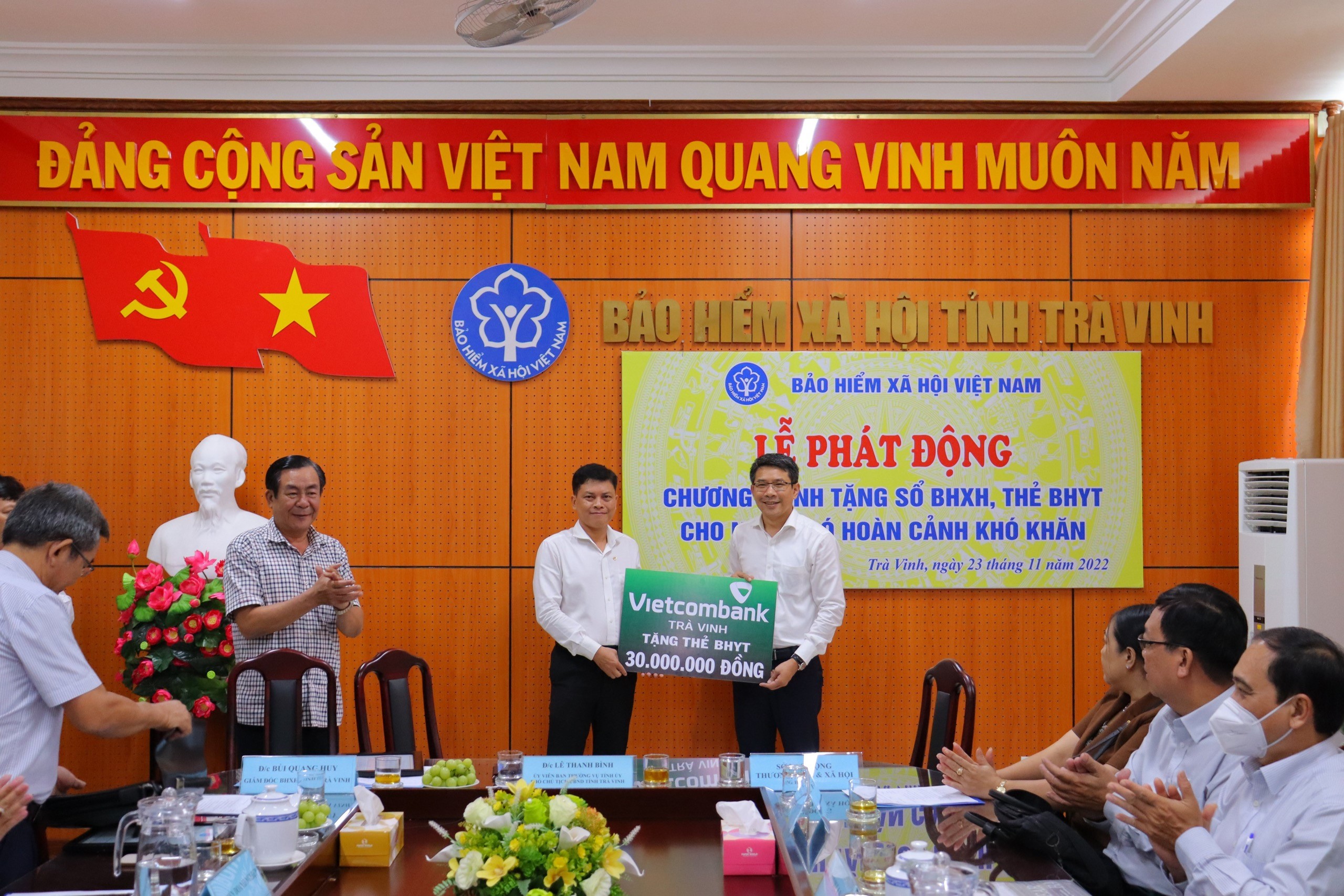 Phát biểu tại buổi lễ, ông Lê Thanh Bình đánh giá cao về ý nghĩa của chương trình tặng sổ BHXH, thẻ BHYT cho người có hoàn cảnh khó khăn trong tỉnh. Chương trình mang giá trị nhân văn cao đẹp, tạo điều kiện thúc đẩy phát triển kinh tế cho hộ dân khó khăn từng bước ổn định đời sống; góp phần thực hiện hiệu quả chương trình xóa đói giảm nghèo trên địa bàn tỉnh Trà Vinh. Thay mặt lãnh đạo tỉnh và người dân được trao tặng sổ BHXH, thẻ BHYT, ông bày tỏ sự cảm ơn và ghi nhận những đóng góp, tấm lòng nhân ái của cán bộ, nhân viên Vietcombank Trà Vinh, đồng thời khẳng định đây là hoạt động ý nghĩa giúp người dân khó khăn được tiếp cận chính sách BHXH, BHYT của Đảng, Nhà nước để phấn đấu, vươn lên ổn định cuộc sống.