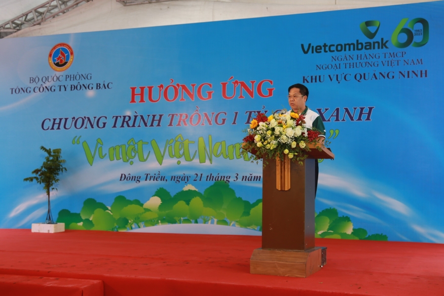 Phát biểu tại chương trình, đồng chí Hoàng Quốc Chiến - Bí thư Đảng ủy, Giám đốc Vietcombank Quảng Ninh chia sẻ: “Trong những năm gần đây, Tổng công ty Đông Bắc và Vietcombank trên địa bàn Quảng Ninh đã thường xuyên phối hợp tổ chức các hoạt động xã hội, thiện nguyện tại các vùng sâu, vùng xa, vùng đồng bào dân tộc thiểu số, khó khăn tại tỉnh Quảng Ninh. Chương trình trồng cây “Vì một Việt Nam xanh” do các đơn vị phối hợp tổ chức là hoạt động ý nghĩa, hưởng ứng đề án “Trồng 1 tỷ cây xanh giai đoạn 2021-2025” của Chính phủ, chương trình trồng rừng gỗ lớn, cây bản địa theo Nghị quyết 08-NQ/TU của UBND tỉnh Quảng Ninh, đồng thời chào mừng kỷ niệm 60 năm thành lập Vietcombank và đón nhận danh hiệu Anh hùng Lao động”.