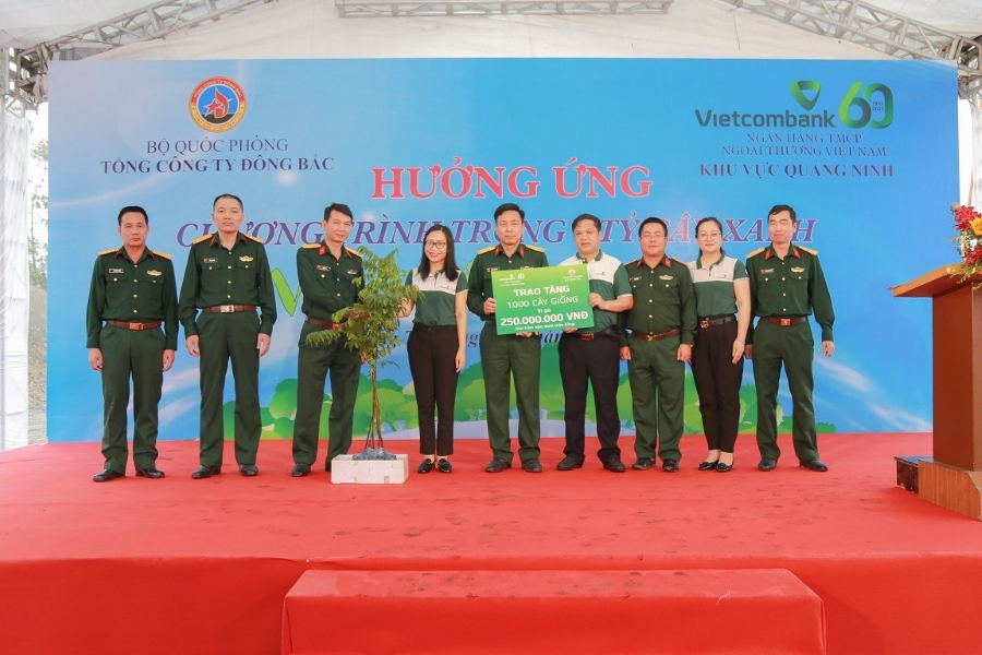 Với mục tiêu xuyên suốt là xây dựng một ngân hàng xanh, phát triển bền vững vì cộng đồng, thực hiện di huấn của Chủ tịch Hồ Chí Minh “Vì lợi ích mười năm trồng cây, vì lợi ích trăm năm trồng người”, đồng chí Hoàng Quốc Chiến - đại diện cho các chi nhánh Vietcombank khu vực Quảng Ninh đã trao tặng 1.000 cây giống là loại cây lâm nghiệp rừng gỗ lớn có giá trị kinh tế cao, phù hợp với thổ nhưỡng, khí hậu của vùng đất thị xã Đông Triều với tổng giá trị 250 triệu đồng. Giá trị tài trợ do toàn thể cán bộ, đảng viên, người lao động các Chi nhánh Vietcombank trên địa bàn chung tay đóng góp.