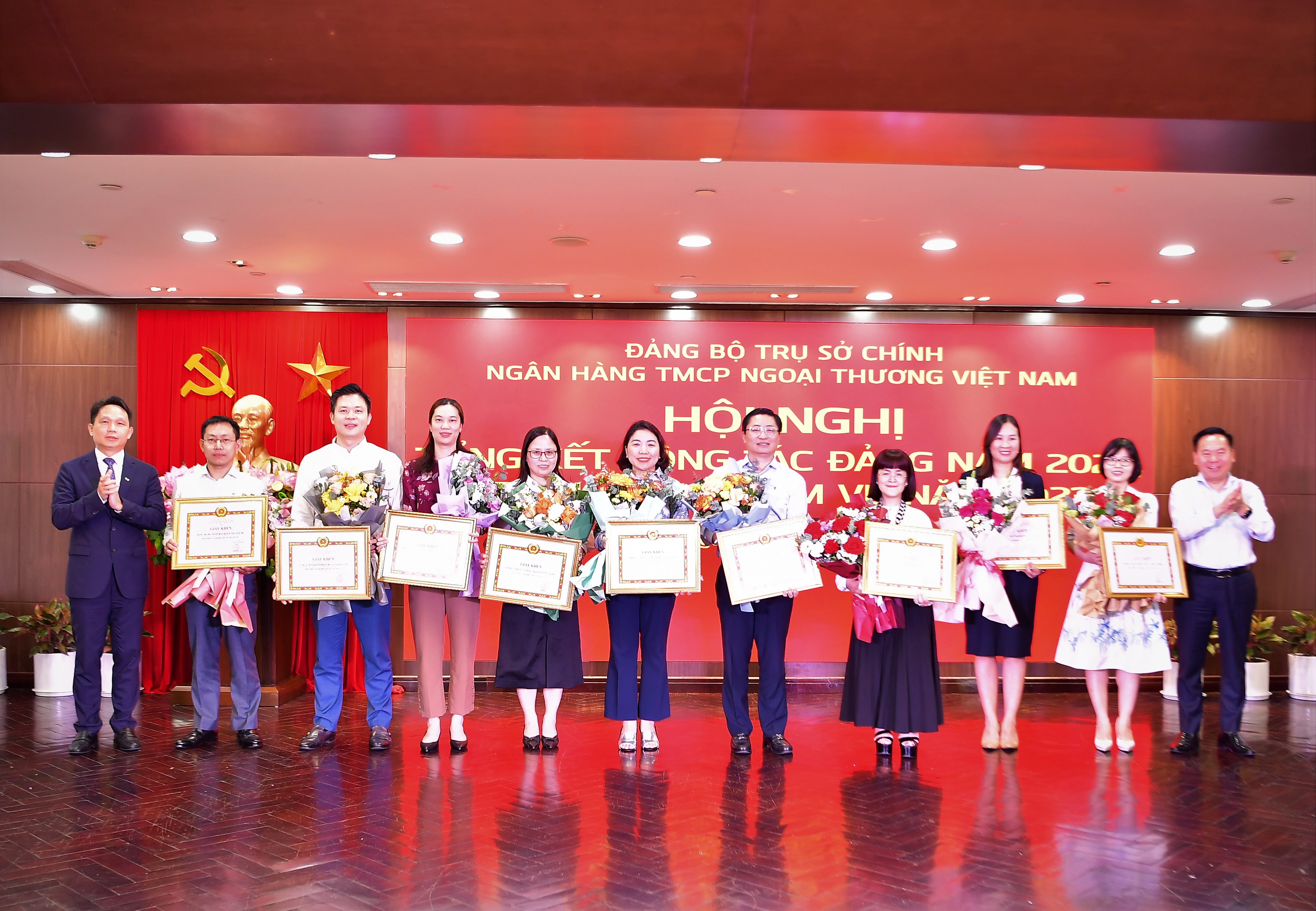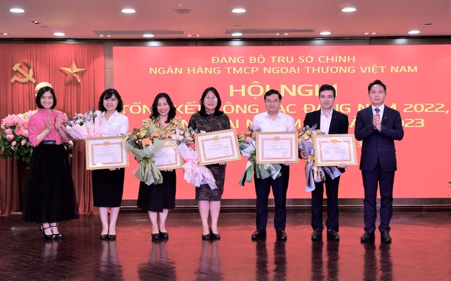 Nhằm ghi nhận những đóng góp của các tập thể và cá nhân có thành tích xuất sắc trong công tác năm 2022, Đảng ủy Viertcombank và Đảng ủy TSC đã quyết định tặng Giấy khen cho các tổ chức Đảng trực thuộc và các đảng viên, gồm: Tặng Giấy khen của Đảng ủy Vietcombank cho đ/c Phạm Thị Nhài, đảng viên Chi bộ 03 (Ban Tổ chức & Nhân sự) trực thuộc Đảng bộ TSC đạt danh hiệu hoàn thành xuất sắc nhiệm vụ 5 năm liền, từ năm 2018 - 2022. Tặng Giấy khen cho 9 tổ chức Đảng trực thuộc “Hoàn thành xuất sắc nhiệm vụ tiêu biểu năm 2022” và khen thưởng đột xuất cho 5 đơn vị đã có nhiều đóng góp tích cực cho công tác và hoạt động thực hiện tốt vai trò lãnh đạo trong công tác chính trị, tư tưởng và công tác xây dựng tổ chức Đảng.
