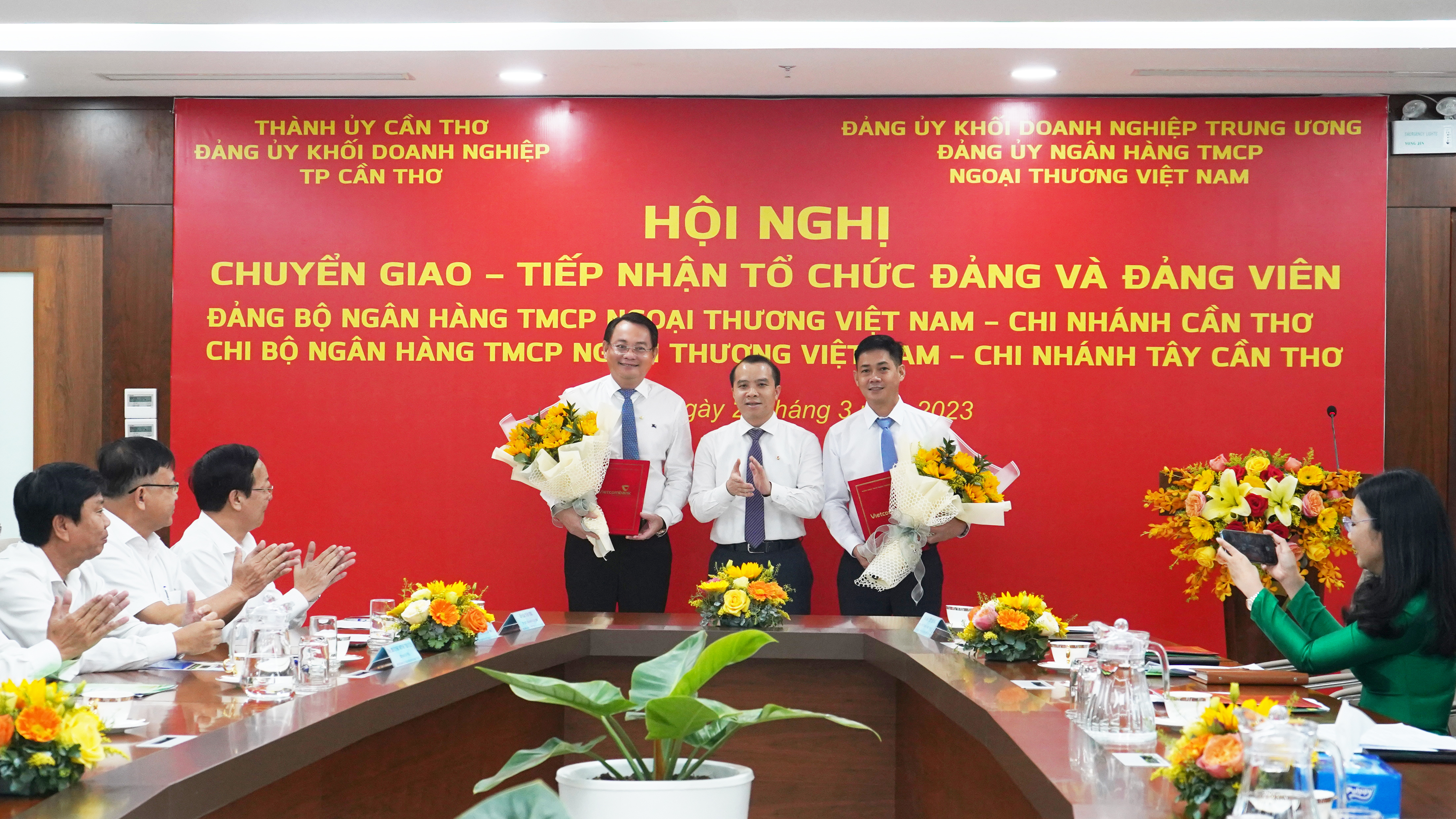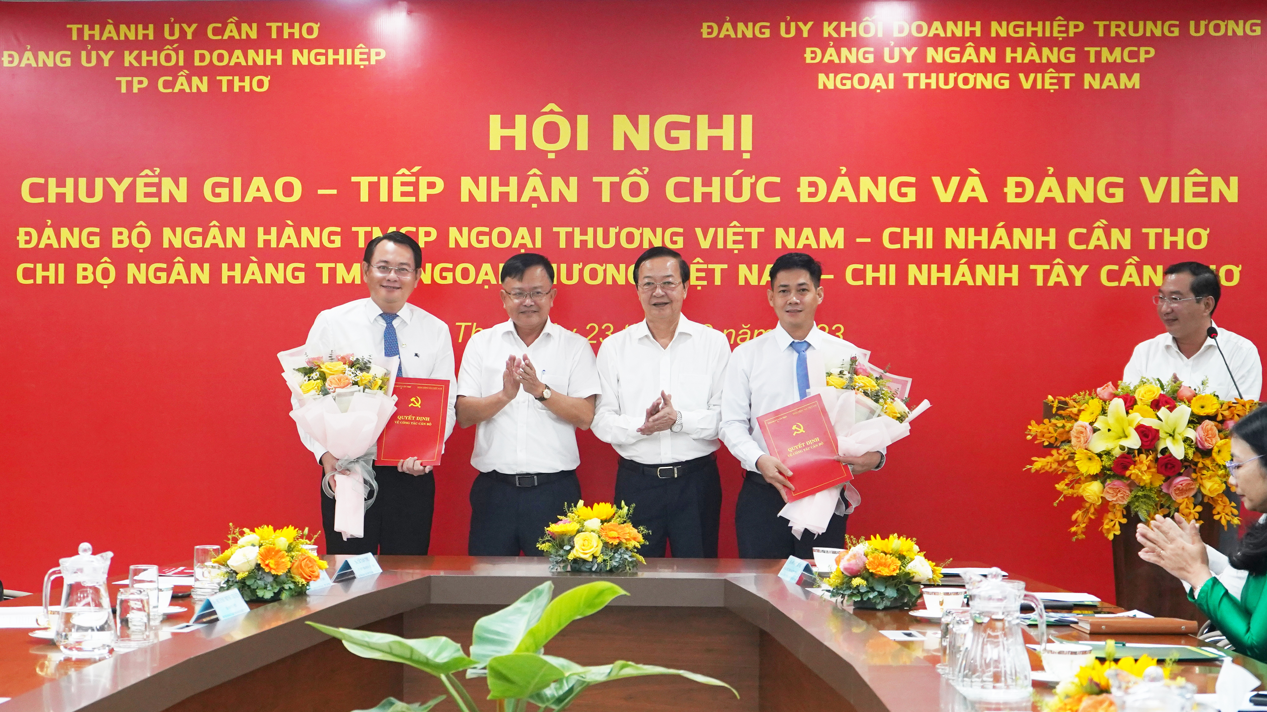 Đ/c chí Lê Tấn Thủ - Ủy viên Ban thường vụ Thành ủy, Trưởng Ban Tổ chức Thành ủy Cần Thơ (thứ hai từ phải sang); đồng chí Nguyễn Trung Nhân - Ủy viên Ban Thường vụ Thành ủy, Chủ tịch Ủy ban MTTQ Việt Nam TP. Cần Thơ (thứ hai từ trái sang) trao quyết định chuyển giao Đảng bộ Vietcombank Cần Thơ và Chi bộ Vietcombank Tây Cần Thơ.