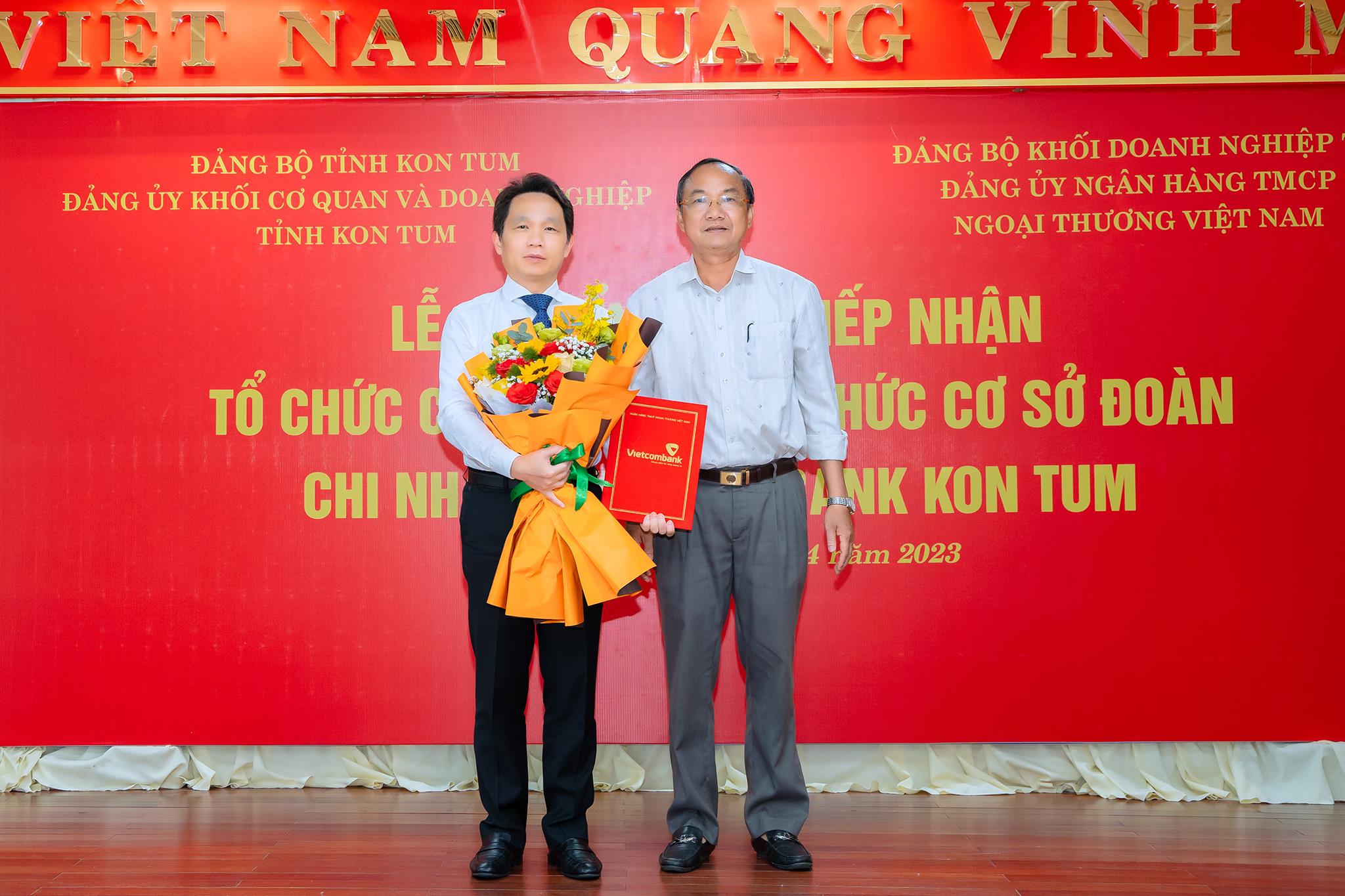 Đ/c Châu Văn Hiệp - Phó Trưởng Ban Tổ chức Tỉnh ủy Kon Tum (bên phải) trao quyết định chuyển giao tổ chức Đảng cho Đảng bộ Vietcombank