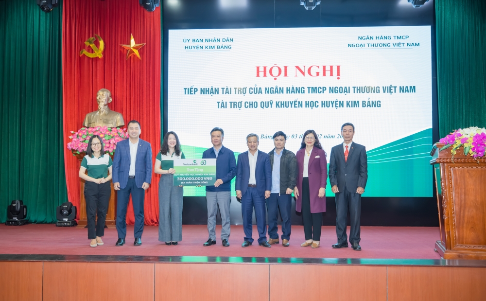 Đại diện Vietcombank, bà Phan Khánh Ngọc - Giám đốc Trung tâm hỗ trợ khách hàng (thứ 3 từ trái sang) trao bảng tượng trưng số tiền hỗ trợ tặng Quỹ khuyến học huyện Kim Bảng