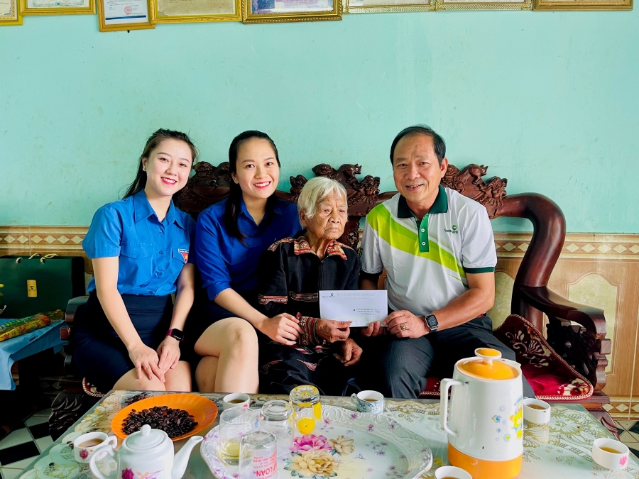 Đại diện BGĐ, BCH Công đoàn, ĐTN Vietcombank Bắc Gia Lai cùng đại diện chính quyền địa phương đến thăm hỏi và tặng quà Mẹ VNAH RoMah Myor