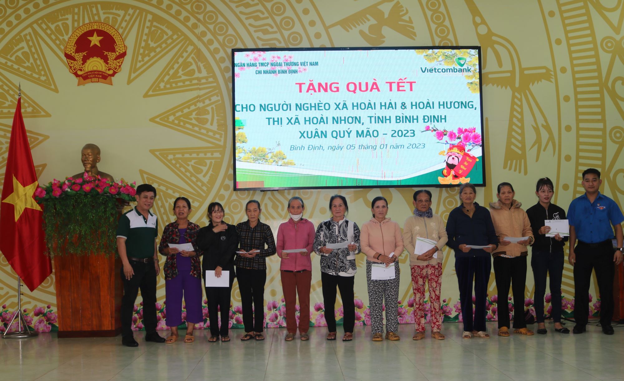 Thực hiện công văn số 1311/VCB-CĐ của Ban Thường vụ Công đoàn Ngân hàng TMCP Ngoại thương Việt Nam về tổ chức chương trình ASXH nhân dịp Tết Nguyên đán Quý Mão 2023, ngày 05 & 06/01/2023, Vietcombank Bình Định đã thực hiện chương trình về thị xã Hoài Nhơn, tỉnh Bình Định thăm, động viên và tặng 150 suất quà (mỗi suất 500 nghìn đồng) cho các gia đình thuộc hộ nghèo ở xã Hoài Hải (97 suất), phường Hoài Hương thị xã Hoài Nhơn (54 suất), phường Quang Trung, Ghềnh Ráng thành phố Quy Nhơn (137 suất), Trung tâm chăm sóc và điều dưỡng người có công (13 suất).