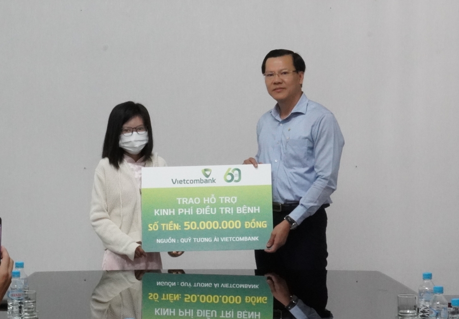 Ông Nguyễn Thái Minh Quang - Bí thư Đảng uỷ, Giám đốc Vietcombank Bình Dương, Ủy viên Ban Chấp hành Công đoàn Vietcombank trao biển tượng trưng hỗ trợ kinh phí điều trị cho bà Chế Huyền Nhung