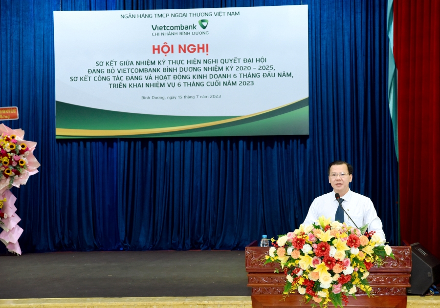 Phát biểu chỉ đạo tại hội nghị, ông Nguyễn Thái Minh Quang - Bí thư Đảng bộ, Giám đốc Vietcombank Bình Dương đã đánh giá tổng thể kết quả hoạt động của chi nhánh trong 06 tháng đầu năm 2023. Theo đó, trong bối cảnh tình hình kinh tế vẫn còn nhiều khó khăn, toàn thể CBNV chi nhánh cần tiếp tục bám sát phương châm và quan điểm chỉ đạo điều hành của Ban lãnh đạo, thực hiện đúng định hướng kinh doanh đã được đề ra, vận dụng linh hoạt, phù hợp, đồng bộ các giải pháp nhằm đảm bảo an toàn trong hoạt động và nâng cao hiệu quả hoạt động kinh doanh. Đồng thời, đồng chí Giám đốc cũng yêu cầu toàn thể cán bộ nhân viên luôn giữ bản lĩnh vững vàng, đoàn kết thống nhất, chủ động trong suy nghĩ và hành động, cùng nhau vượt qua khó khăn, thách thức trong thời gian tới.