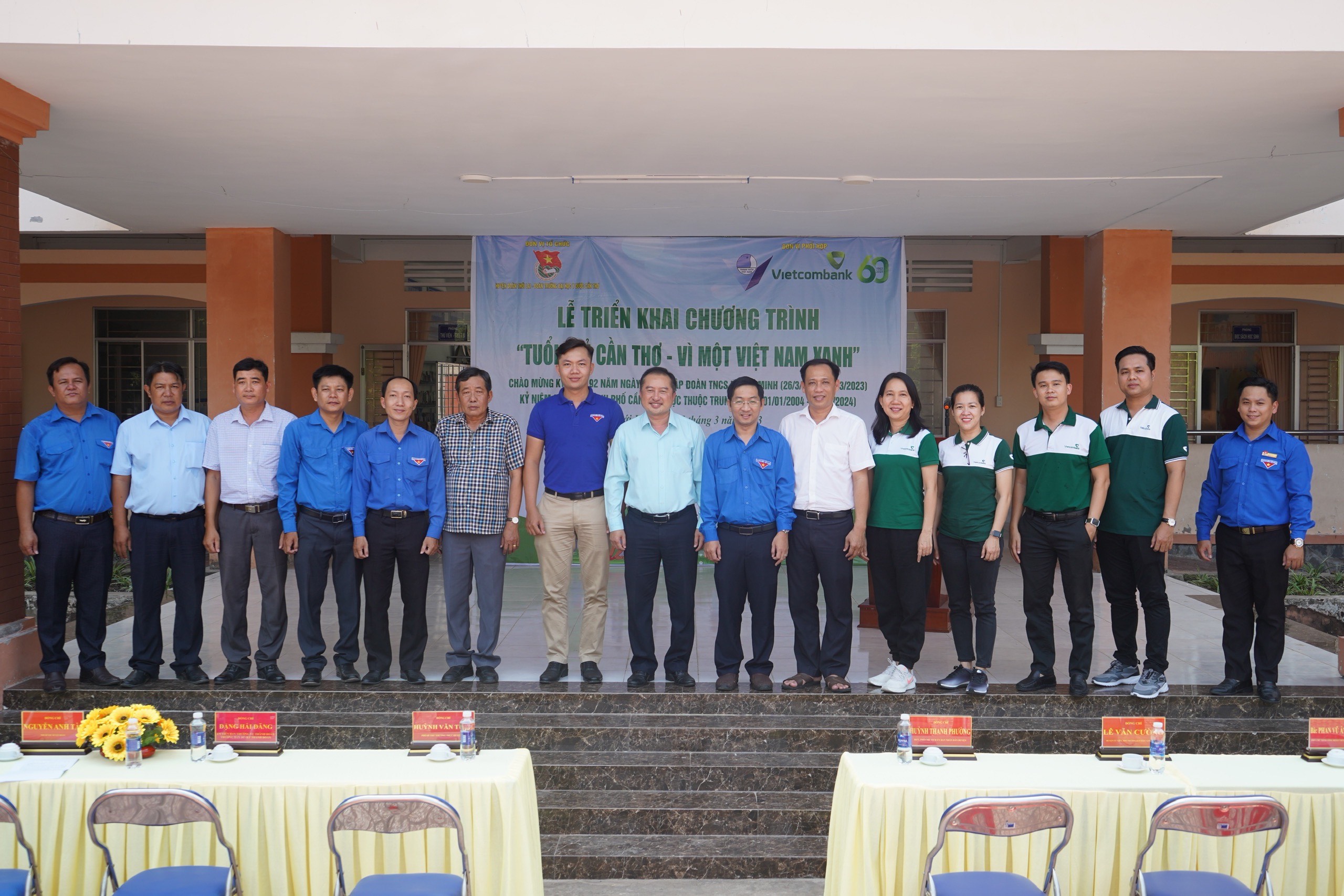 Lãnh đạo thành đoàn Thành phố Cần Thơ, lãnh đạo địa phương huyện Thới Lai - Cần Thơ chụp ảnh kỷ niệm cùng Vietcombank Cần Thơ và Vietcombank Tây Cần Thơ