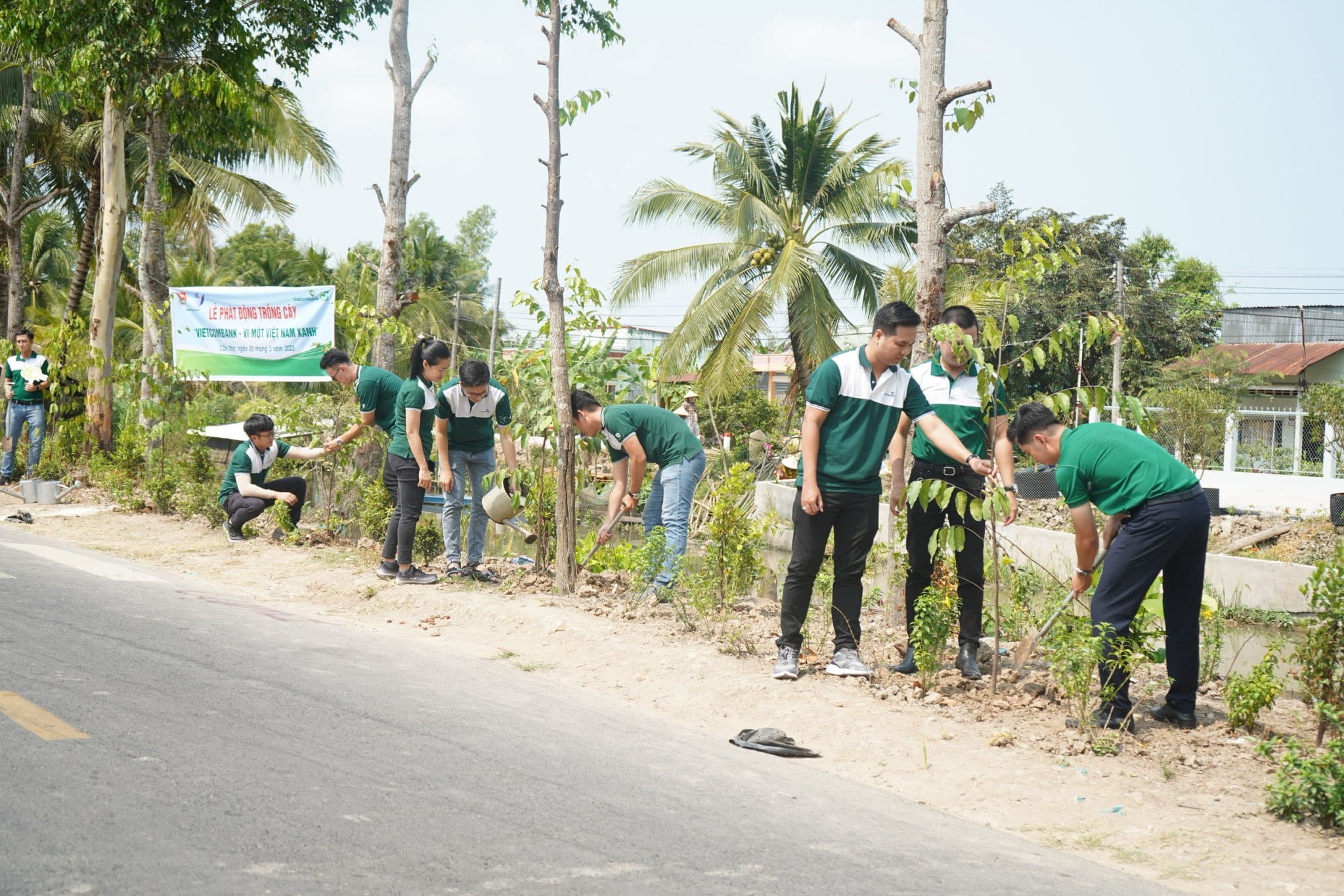Đoàn viên thanh niên Vietcombank Cần Thơ và Vietcombank Tây Cần Thơ trồng cây sao dầu tại huyện Thới Lai - Cần Thơ