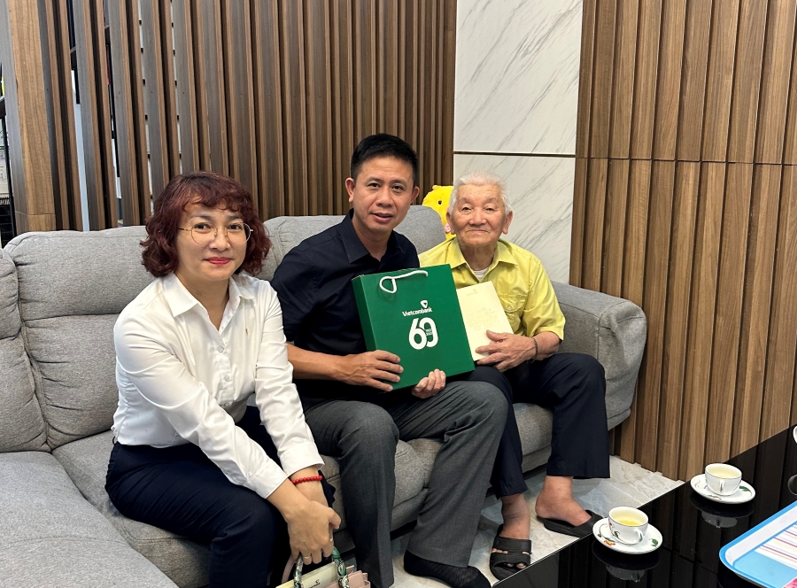 Ông Lý Hoàng Vũ - Giám đốc chi nhánh cùng đại diện BCH CĐ Vietcombank Đà Nẵng thăm cụ Vũ Tấn Ích - Anh hùng LLVT, thương binh, cha của cán bộ Vietcombank Đà Nẵng