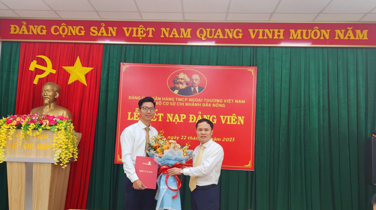 Tham dự buổi Lễ có đ/c Lê Kỳ - Bí thư Chi bộ, Giám đốc Vietcombank Đăk Nông; đ/c Trần Phạm Như Phương - Chủ tịch công đoàn, Phó Giám đốc; đại diện Ban Chấp hành Chi đoàn, cùng toàn thể đảng viên và các quần chúng ưu tú của Chi nhánh.