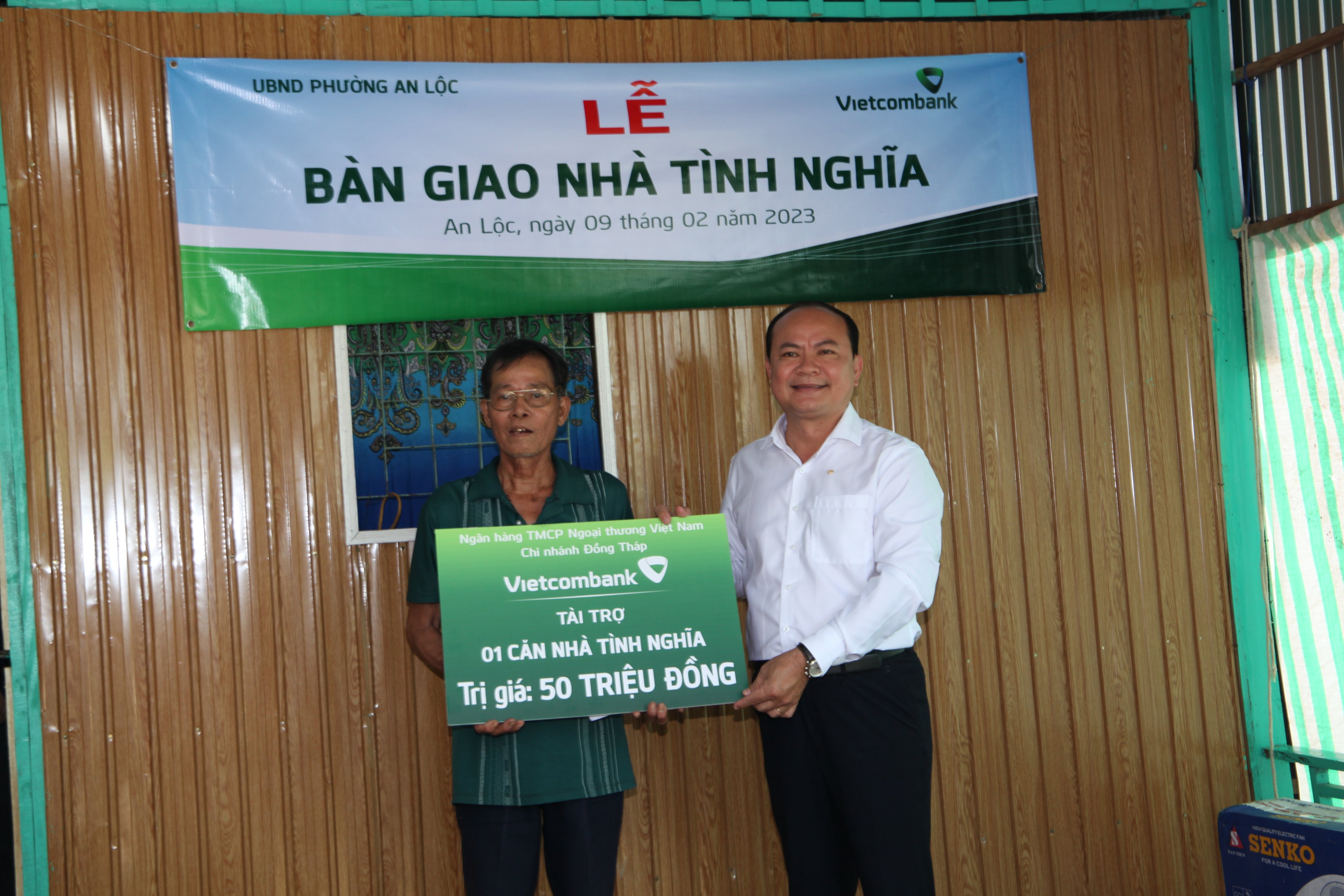 Căn nhà được bàn giao cho hộ gia đình ông Thái Văn Thúc, có diện tích 51 mét vuông, nhà sàn bằng gỗ, mái lợp tôn. Vietcombank Đồng Tháp hỗ trợ 50 triệu đồng kinh phí xây dựng.