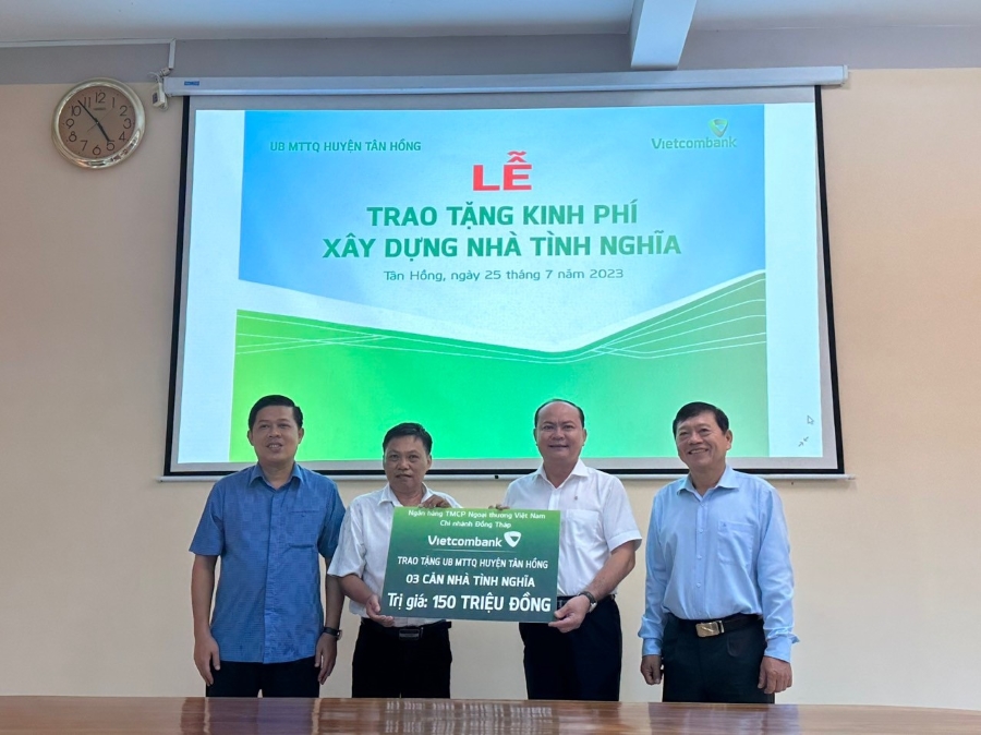 Ông Phan Duy Phúc - Bí thư Đảng bộ cơ sở, Giám đốc Vietcombank Đồng Tháp (thứ 2 từ phải qua) trao bảng bảng tượng trưng kinh phí xây nhà tình nghĩa cho đại diện lãnh đạo MTTQVN huyện Tân Hồng
