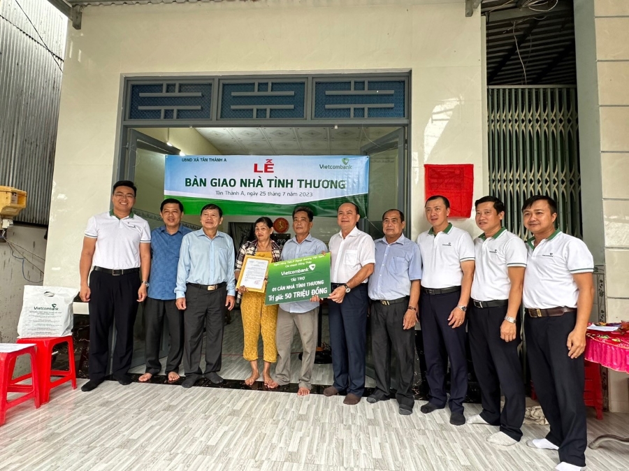 Ông Phan Duy Phúc - Bí thư Đảng bộ cơ sở, Giám đốc Vietcombank Đồng Tháp (thứ 5 từ phải qua) bàn giao nhà tình thương cho hộ ông Trần Văn Hùng xã Tân Thành A