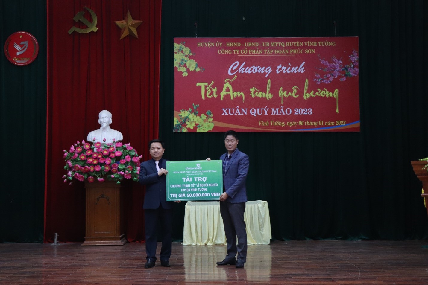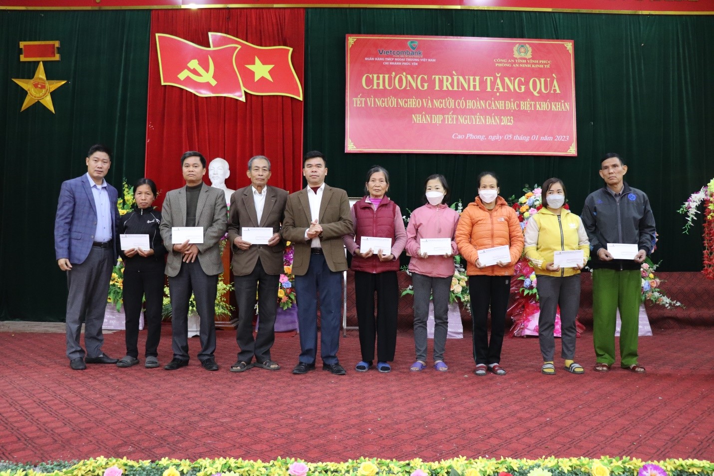 Nhân dịp Xuân Quý Mão năm 2023, Vietcombank Phúc Yên đã đến thăm hỏi, động viên và trao 200 suất quà Tết với tổng trị giá 100 triệu đồng (500 nghìn đồng/suất) cho các hộ nghèo và gia đình có hoàn cảnh khó khăn tại các huyện Sông Lô, Lập Thạch, Vĩnh Tường.