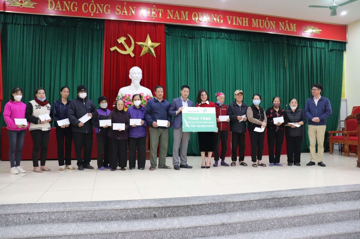 Ông Nguyễn Sơn Hải - Phó Giám đốc Vietcombank Phúc Yên (ngoài cùng bên trái) trao quà Tết cho các hộ nghèo và các gia đình có hoàn cảnh khó khăn nhân dịp Tết Quý Mão 2023