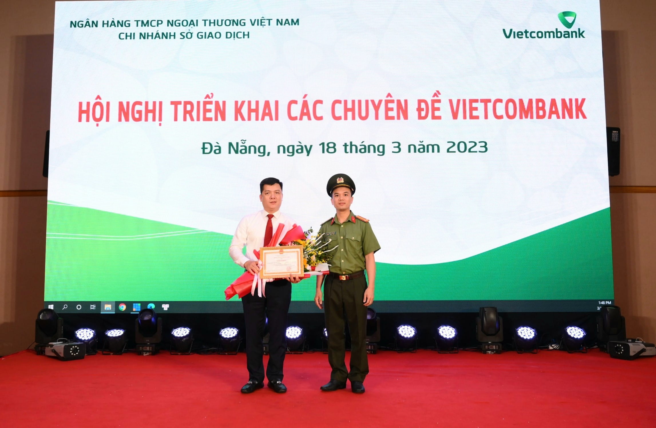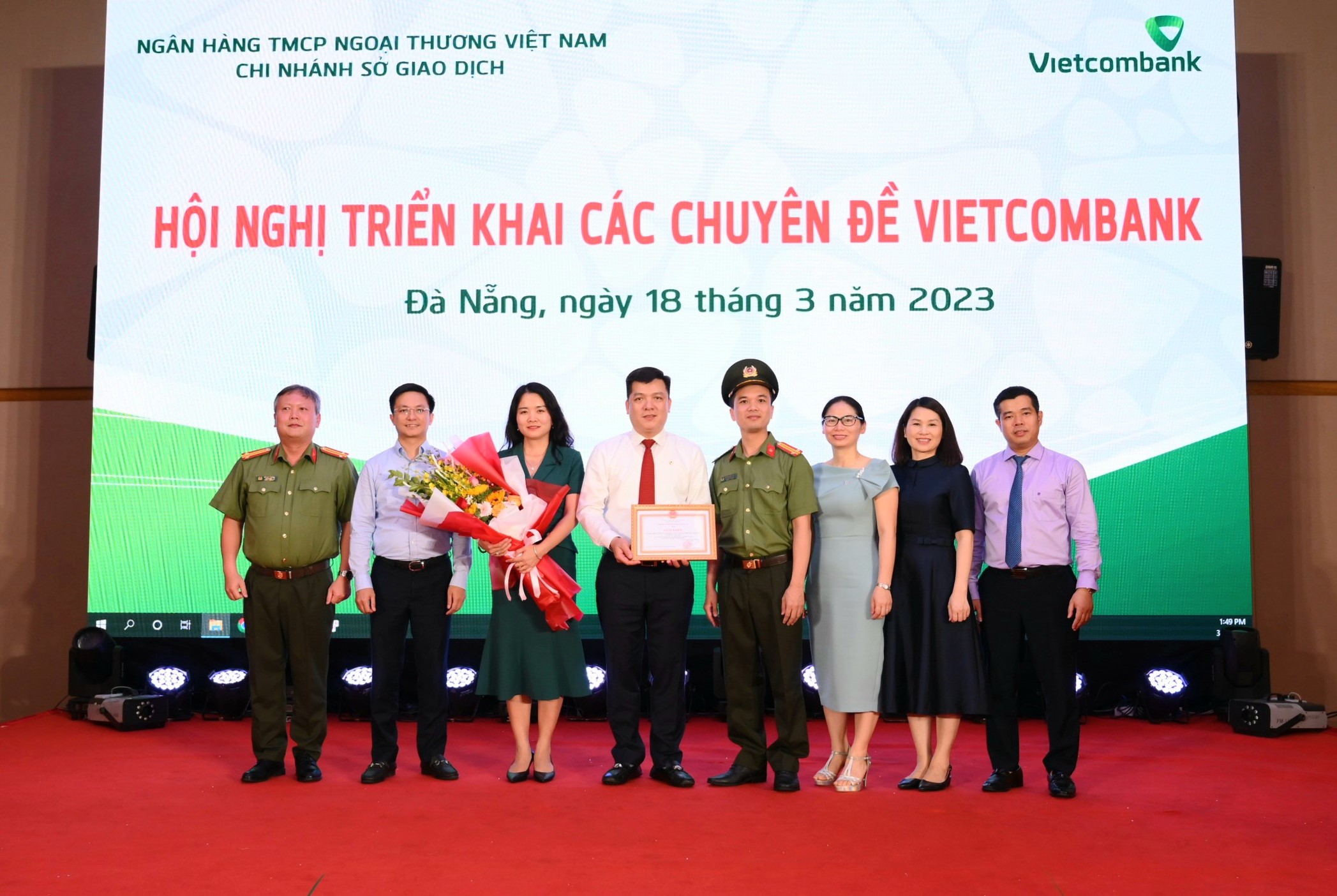 Thay mặt lãnh đạo Công an thành phố Hà Nội, Trung tá Hoàng Anh Dũng - Phó Trưởng phòng An ninh kinh tế, Công an Thành phố Hà Nội đã công bố quyết định của Giám đốc Công an TP. Hà Nội về việc trao tặng Giấy khen cho tập thể Vietcombank Sở giao dịch và cá nhân ông Hồ Văn Tuấn - Giám đốc Chi nhánh với thành tích xuất sắc trong phong trào thi đua toàn dân bảo vệ an ninh Tổ quốc trên địa bàn thành phố Hà Nội năm 2022.