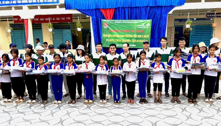 Đoàn viên thanh niên Vietcombank Tân Định trực tiếp trao quà và chụp hình lưu niệm cùng các em học sinh