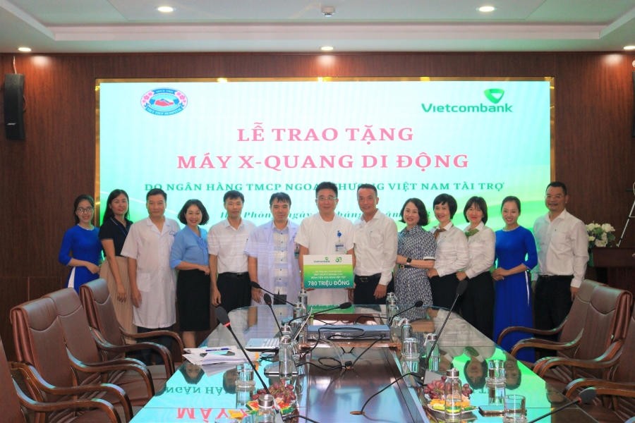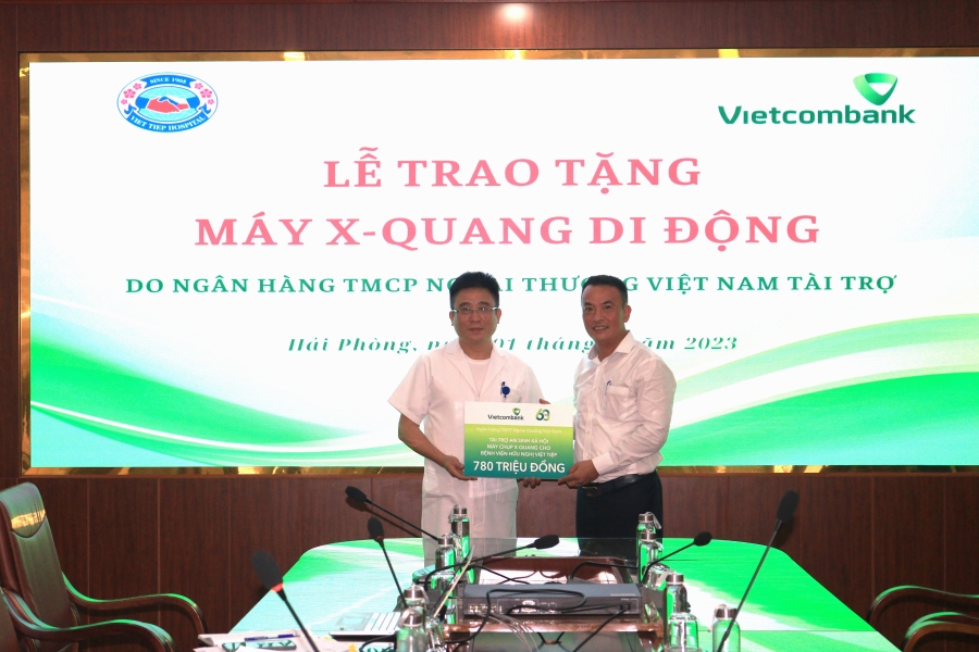 Đại diện Vietcombank, ông Lê Hoàng Cương - Giám đốc Chi nhánh Nam Hải Phòng trao tặng máy Xquang di động kĩ thuật số cho đại diện Bệnh viện Hữu nghị Việt Tiệp, ông Đỗ Mạnh Thắng - Giám đốc
