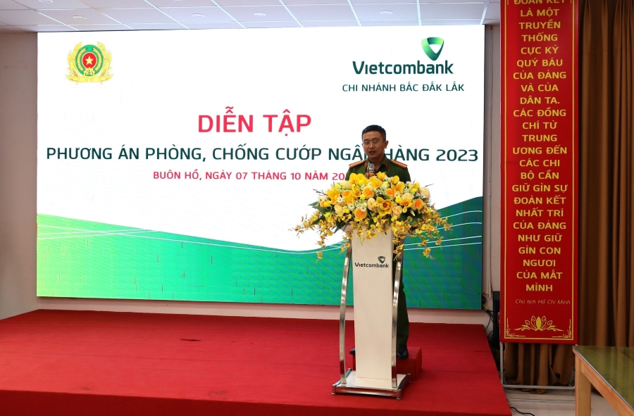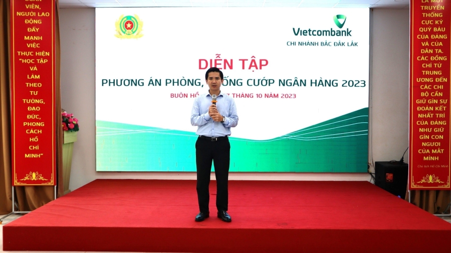 Ngày 07/10/2023, tại trụ sở chi nhánh, Vietcombank Bắc Đắk Lắk đã phối hợp với cơ quan Công an thị xã Buôn Hồ tổ chức diễn tập phương án phòng, chống cướp ngân hàng.