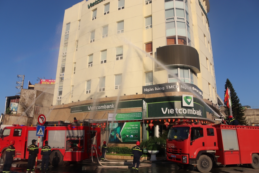 Phòng cảnh sát PCCC&CNCH thực hiện chữa cháy bằng vòi nước và xe cứu hỏa dập tắt đám cháy giả định tại trụ sở chi nhánh