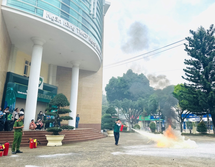 Đây là hoạt động thường niên tại Vietcombank Đắk Lắk nhằm nâng cao ý thức cảnh giác, tinh thần chủ động trong công tác PCCC của toàn thể cán bộ nhân viên. Chương trình được triển khai với các nội dung thiết thực như: giải quyết triệt để khó khăn vướng mắc từng phòng ban trực trong công tác PCCC tại đơn vị, tập huấn kỹ năng sử dụng bình chữa cháy CO2, bình bột, sử dụng lăng, vòi; cách xử lý các tình huống dập và khống chế đám cháy qua thực tập chữa cháy mô phỏng đám cháy nhỏ ngay tại trụ sở chi nhánh.
