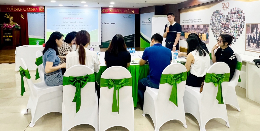 Vừa qua, tại Trụ sở chi nhánh, Vietcombank Thăng Long đã phối hợp cùng Trường đào tạo và phát triển nguồn nhân lực Vietcombank tổ chức thành công chuỗi chương trình đào tạo về “Kỹ năng bán hàng qua điện thoại” và “Kỹ năng nắm bắt bắt tâm lý khách hàng & nâng cao chất lượng dịch vụ 5*” với sự tham dự của thành viên Ban Giám đốc cùng toàn thể lãnh đạo, cán bộ bán hàng các phòng tại chi nhánh và sự tham gia của giảng viên Trương Văn Tuất là chuyên gia đào tạo hàng đầu về đào tạo kỹ năng bán hàng.