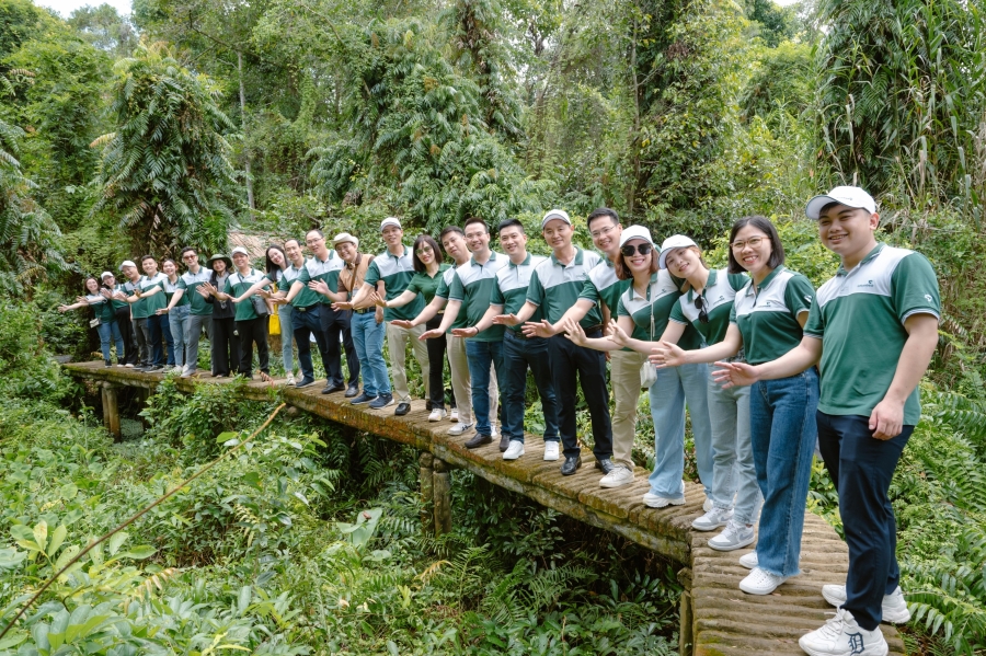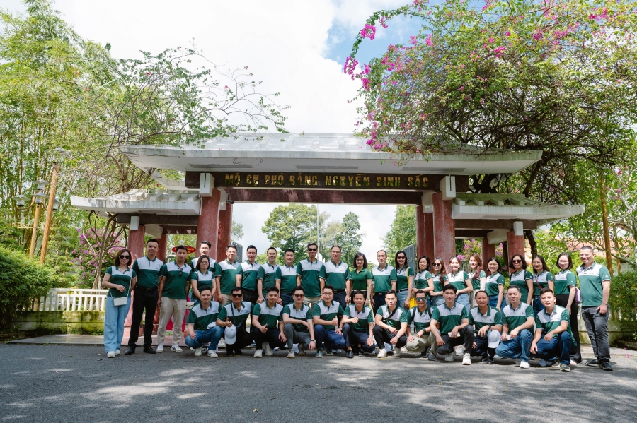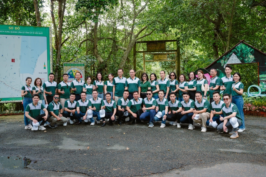 Tập thể đoàn Vietcombank Bắc Hà Nội chụp ảnh lưu niệm tại khu di tích Xẻo Quít