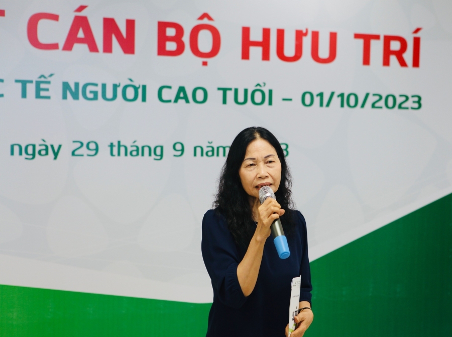 Bà Phạm Thị Mai - nguyên Phó Giám đốc Vietcombank Sở giao dịch thay mặt cán bộ hưu trí phát biểu tại buổi gặp mặt